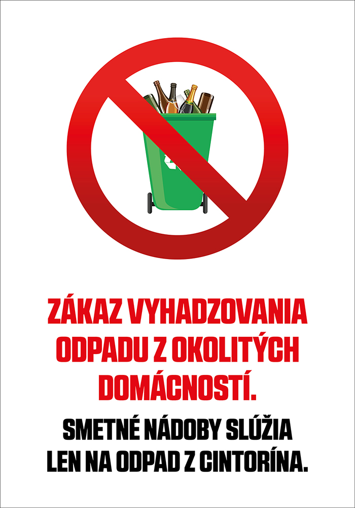 Dôrazne upozorňujeme občanov, aby nevyhadzovali do kontajnerov umiestnených v areáli cintorínov odpad z domácností a odpad, ktorý tam nepatrí. Kontajnery umiestnené v areáloch cintorínov slúžia výlučne pre uloženie odpadu z cintorína. Ak obec identifikuje alebo obdrží informáciu, že niekto konkrétny toto nerešpektuje, tak dotyčný uhradí vývoz kontajnera.