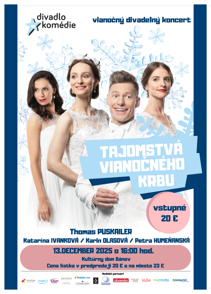 Pozývame Vás na vianočný divadelný koncert o predvianočnom čase v podaní Divadla komédie s názvom "Tajomstvá vianočného krbu", ktorý sa uskutoční v sobotu 13. decembra 2025 o 16:00 hod. v Kultúrnom dome Bánov s voľným sedením.