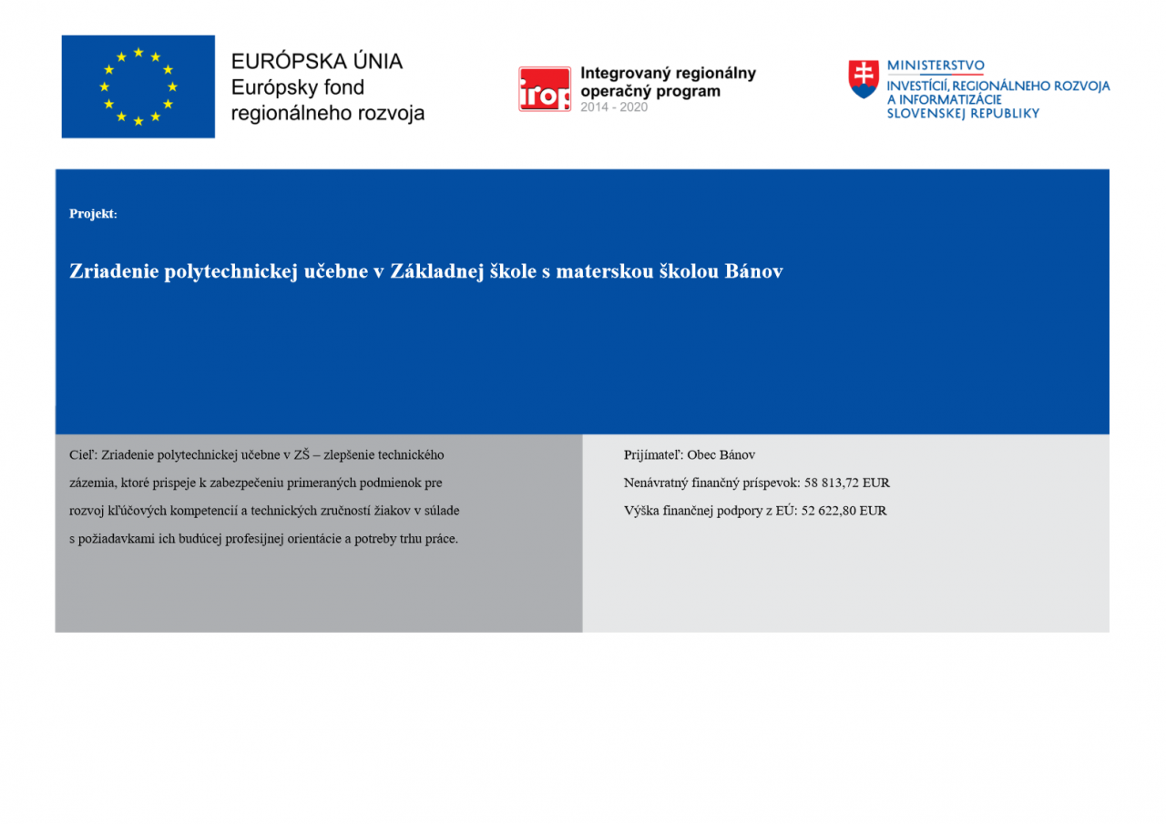 Názov projektu: Zriadenie polytechnickej učebne v Základnej škole s materskou školou Bánov