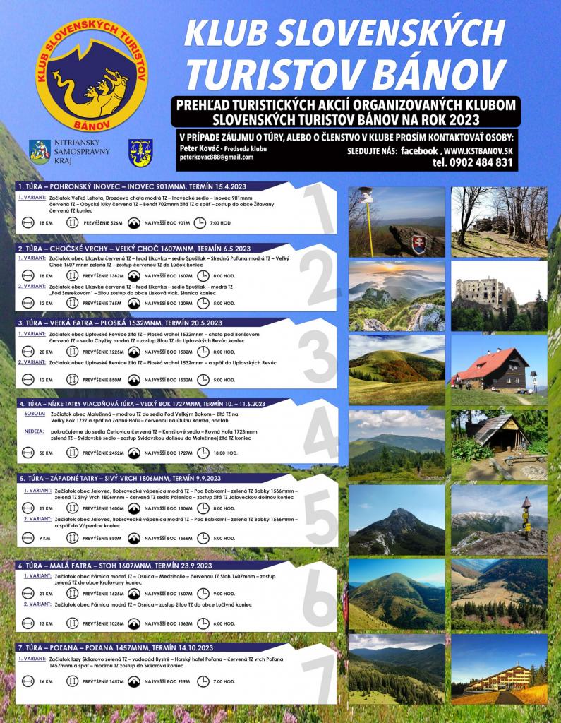 Klub Slovenských turistov Bánov dáva do pozornosti prehľad turistických akcií organizovaných klubom. V prípade záujmu o túru, alebo členstvo v klube prosím kontaktovať predsedu klubu Petra Kováča na tel. čísle 0902 484 831 alebo emailom peterkovac888@gmail.com