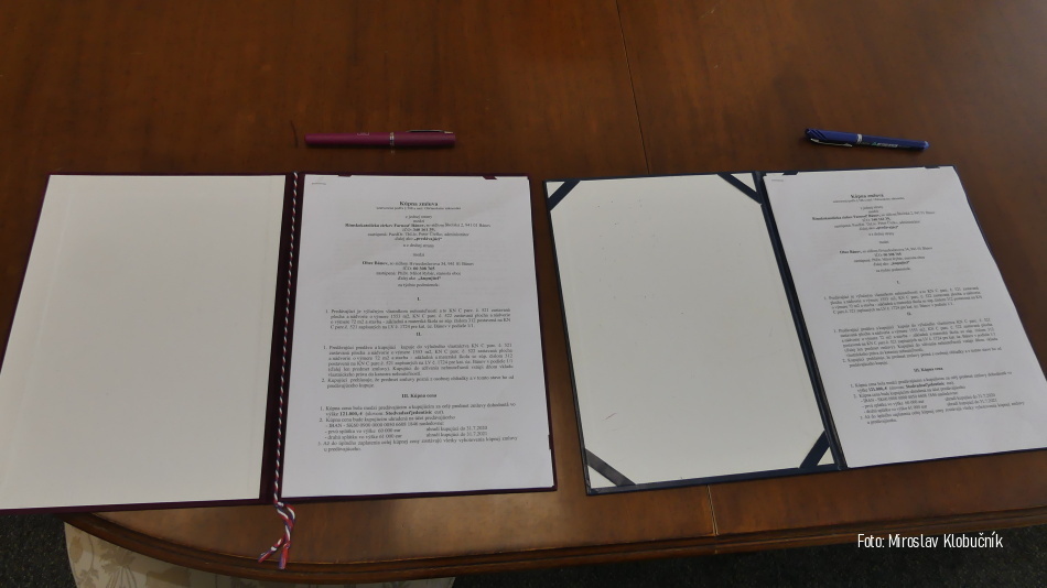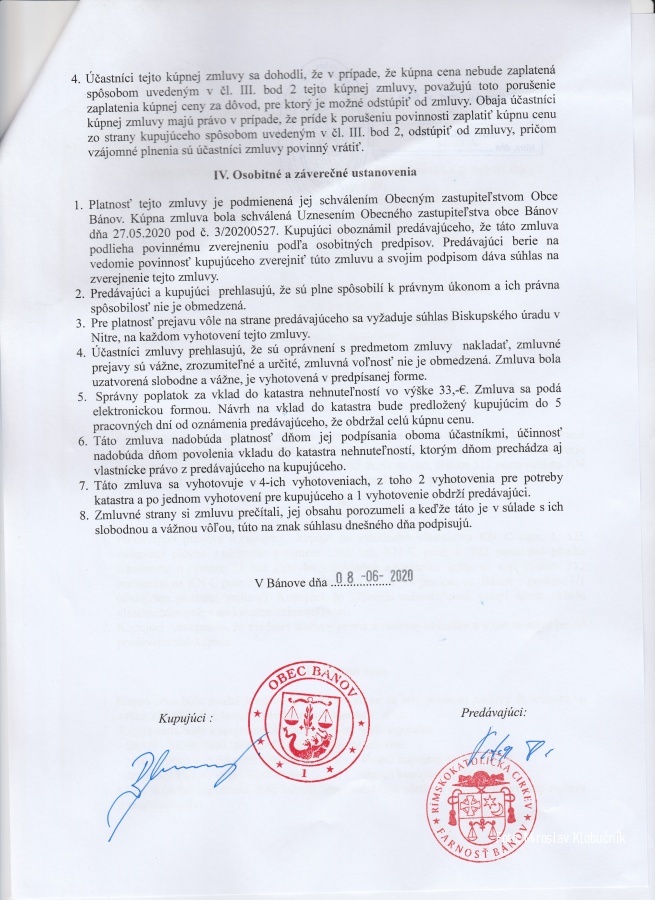 Dňa 8.6.2020 bola podpísaná Kúpna zmluva medzi Obcou Bánov a Rímskokatolíckou Cirkvou Farnosť Bánov o odkúpení starej budovy školy v centre obce pri kostole. Obecné zastupiteľstvo Bánov dňa 27.5.2020 uznesením č. 3/20200527 jednohlasne za účasti všetkých 11 poslancov odsúhlasilo túto kúpu a znenie Kúpnej zmluvy. Po niekoľkých rokoch sa nám podarilo dohodnúť sa a výsledkom je, že obec získa túto budovu aj s pozemkom v dvoch splátkach do svojho vlastníctva. Finančné prostriedky, ktoré získa Farnosť Bánov z tejto kúpy budú použité na novú strechu kostola. Foto: M. Klobučník