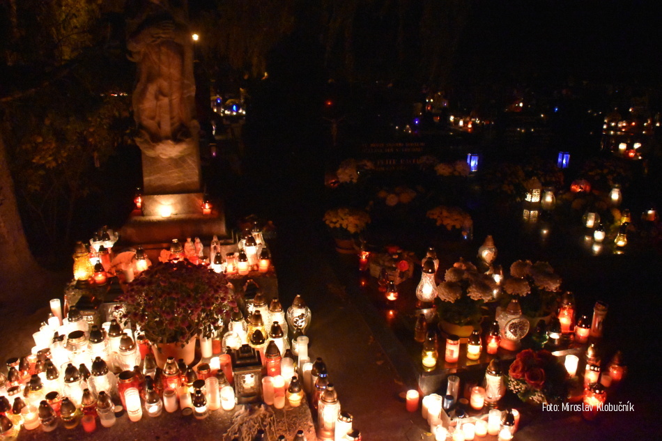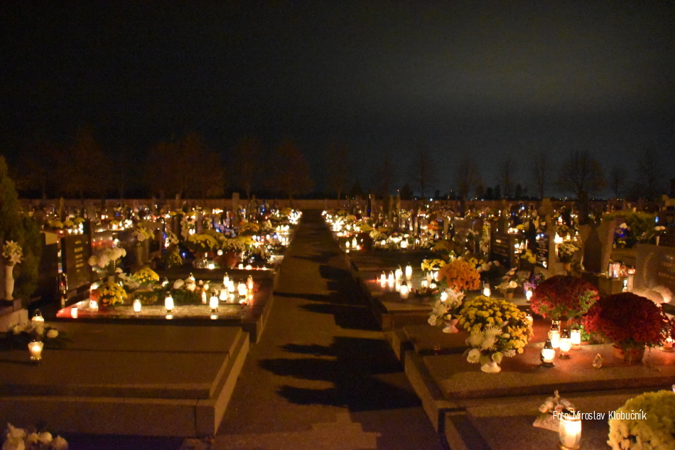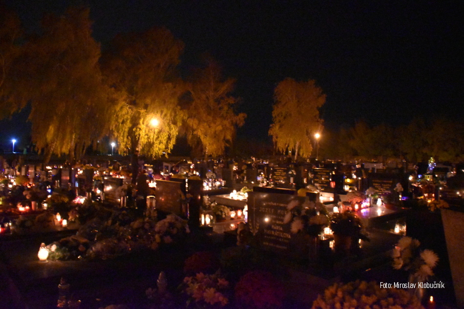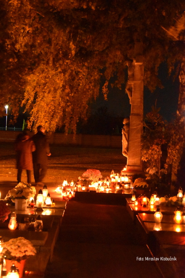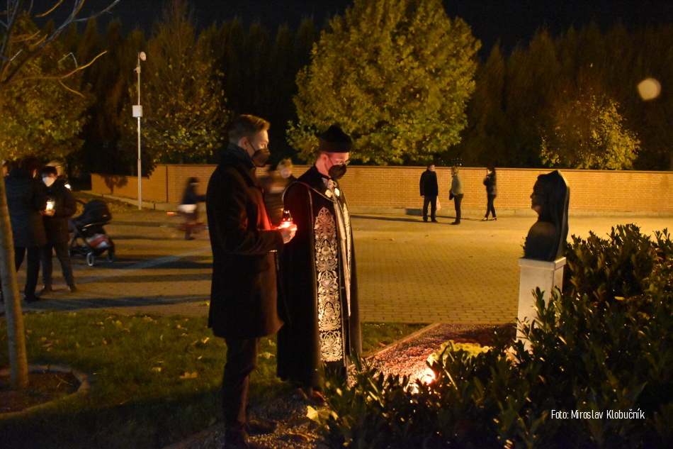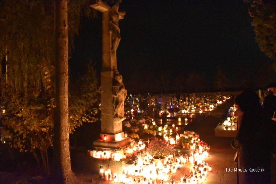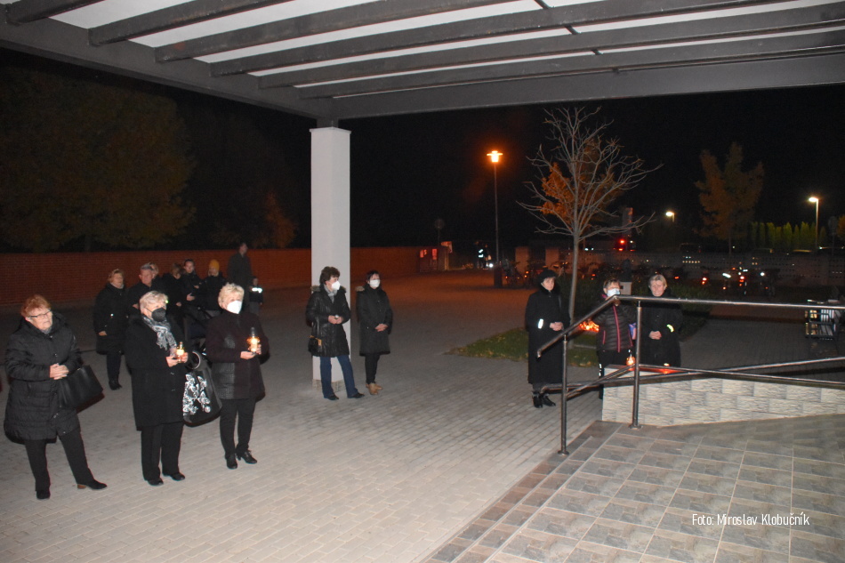 Dušičková pobožnosť so sviečkami sa uskutočnila v pondelok 1. novembra 2021 o 18:00 hod. na novom cintoríne pri Dome smútku a nádeje Bánov. Pobožnosť viedol správca farnosti PaedDr. ThLic. Peter Čieško a svoj príhovor predniesol tiež pán starosta PhDr. Miloš Rybár. Foto: M. Klobučník