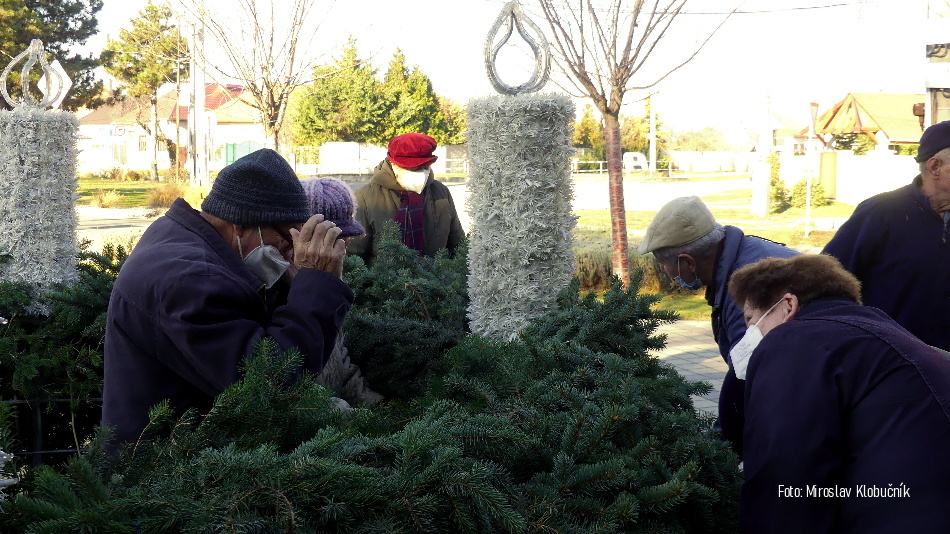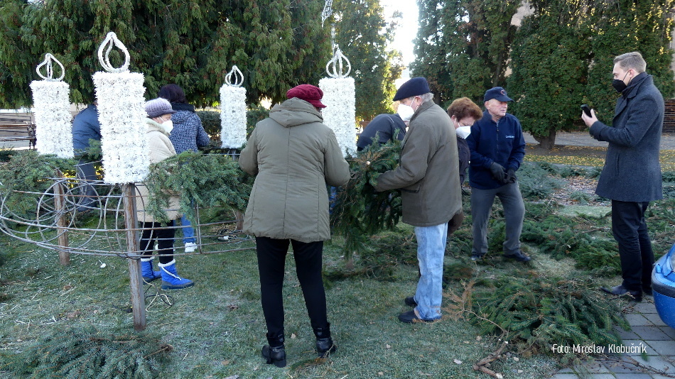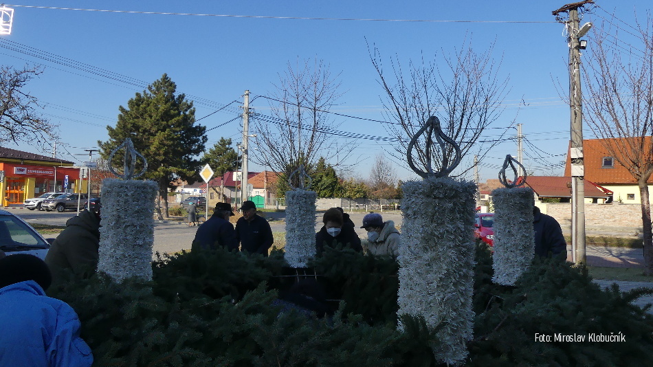 Adventný veniec v centre obce je každoročne kolektívnym dielom občanov. Po inštalácii konštrukcie, ktorú zabezpečila Správa majetku obce Bánov, sme v stredu 24.11.2021 pokračovali vo viazaní čečiny, ktorú zabezpečili členovia Klubu dôchodcov v Bánove. Foto: M. Klobučník