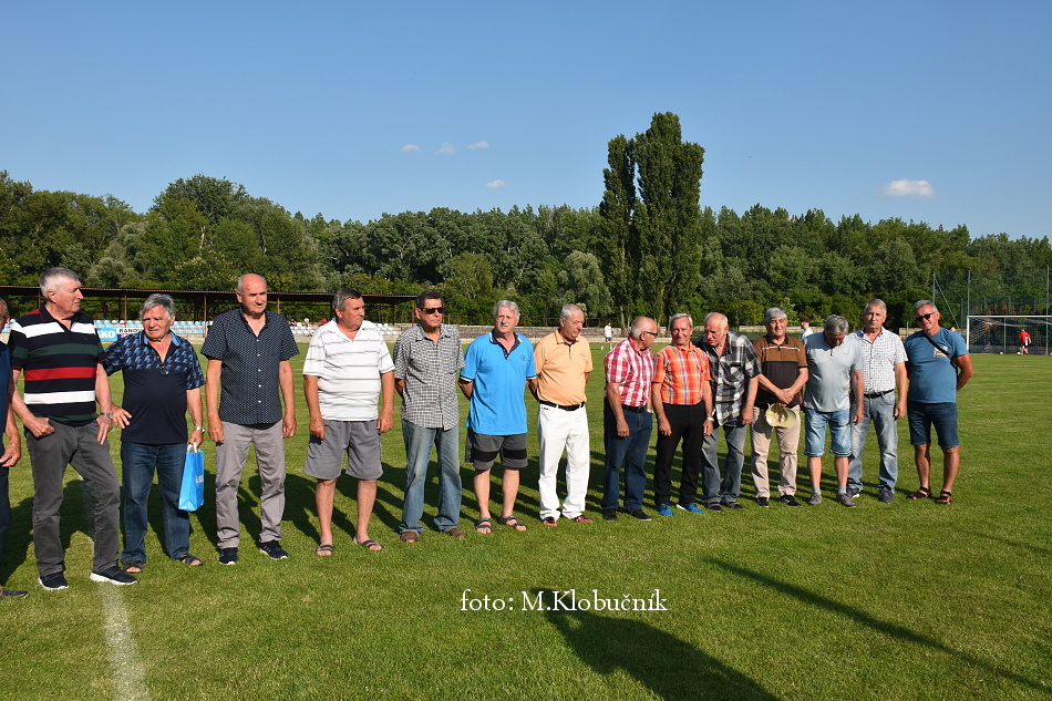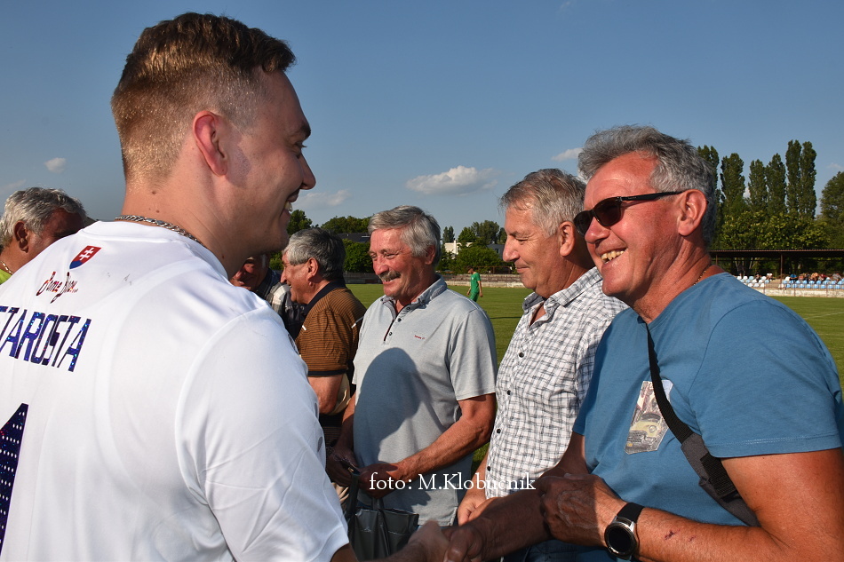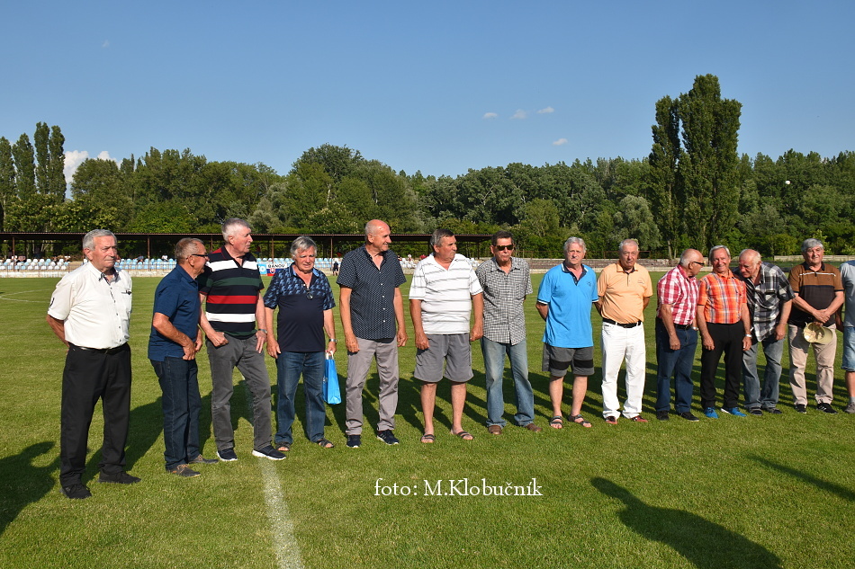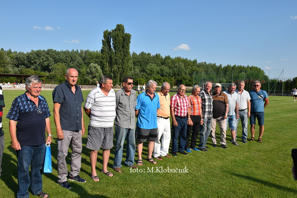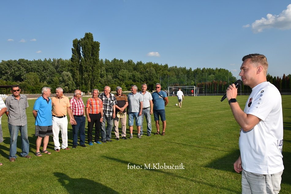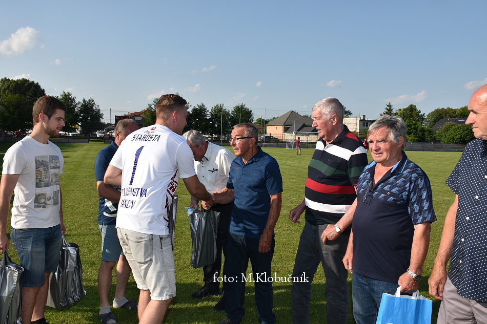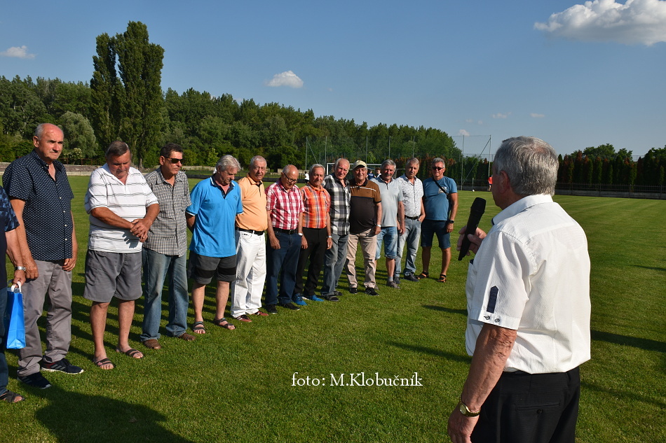 V nedeľu 18. júna sme si v polčasovej prestávke majstrovského futbalového zápasu mužov dôstojne pripomenuli 50. výročie postupu našich futbalistov do Majstrovstva kraja 1973. Po úvodnom slove sa bývalým futbalistom v príhovore osobne poďakoval starosta obce a odovzdal im dar. Foto: Miroslav K.