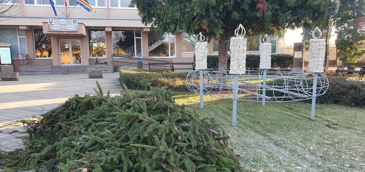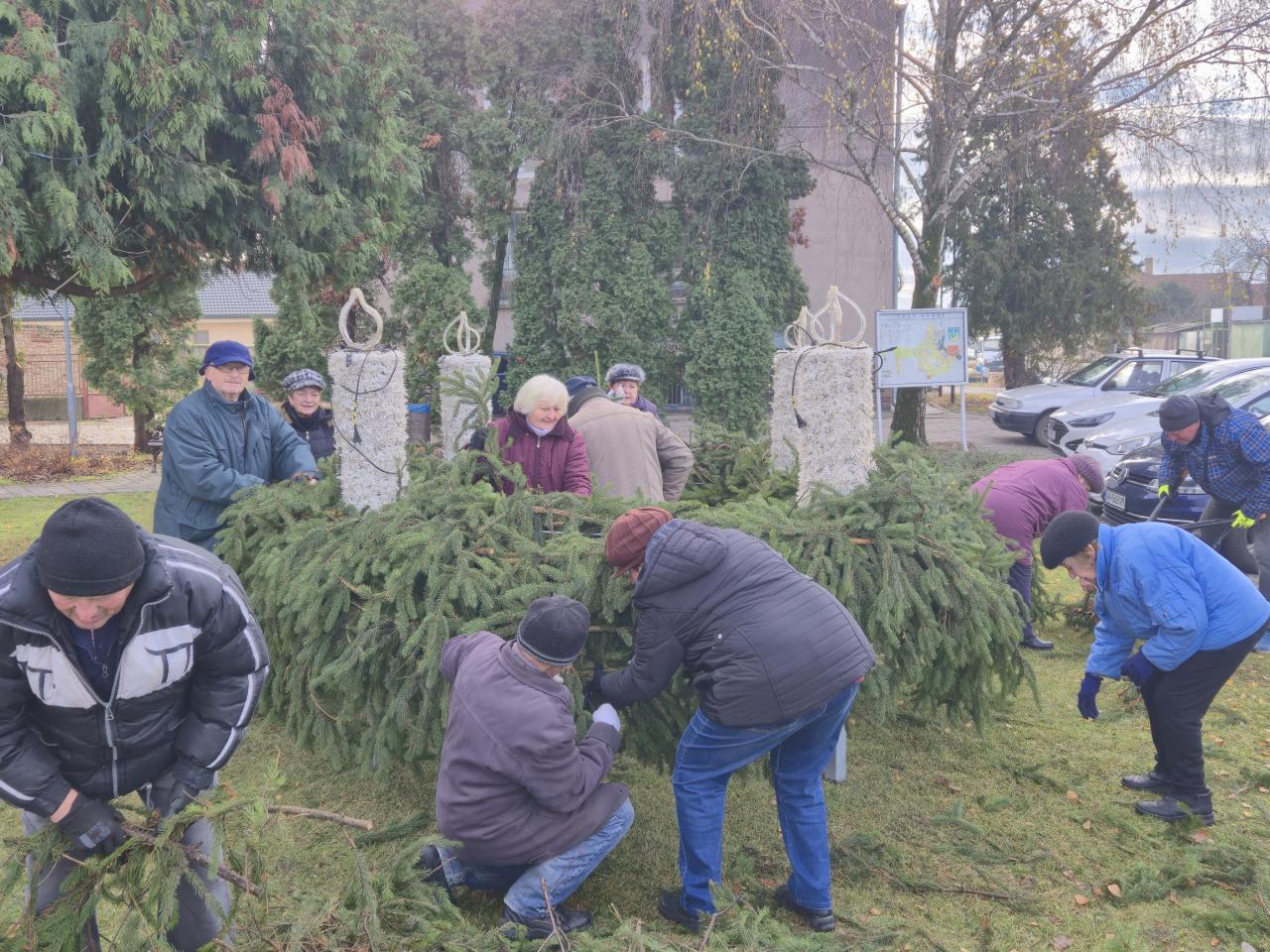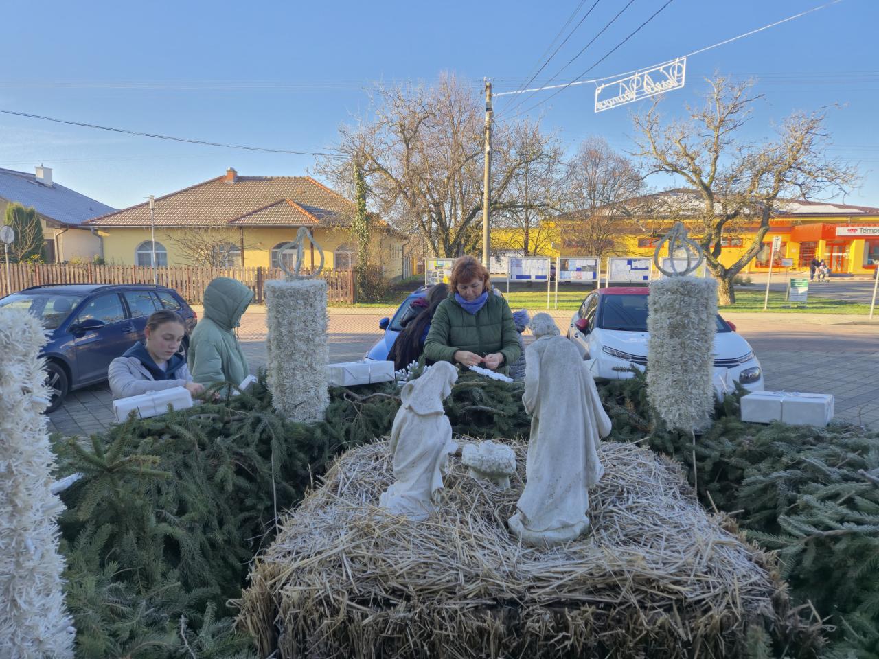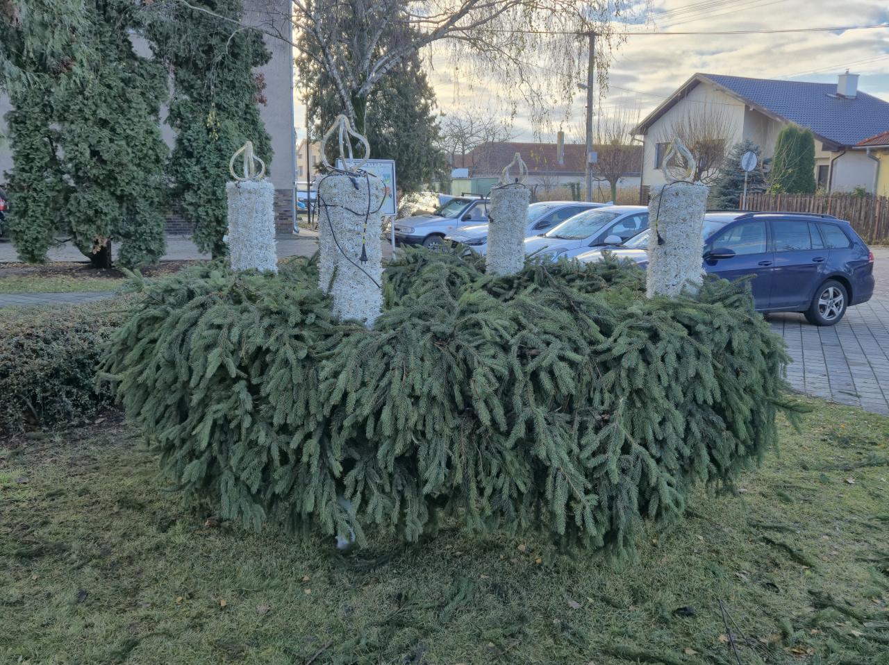 Adventný veniec v centre obce je každoročne kolektívnym dielom občanov. Inštaláciu konštrukcie zabezpečila Správa majetku obce Bánov. Viazanie čečiny zabezpečili členovia Klubu dôchodcov Bánov a Jednoty dôchodcov Slovenska ZO Bánov. Veniec ozdobili deti a žiaci zo ZŠ s MŠ Bánov. Foto: Adam R.